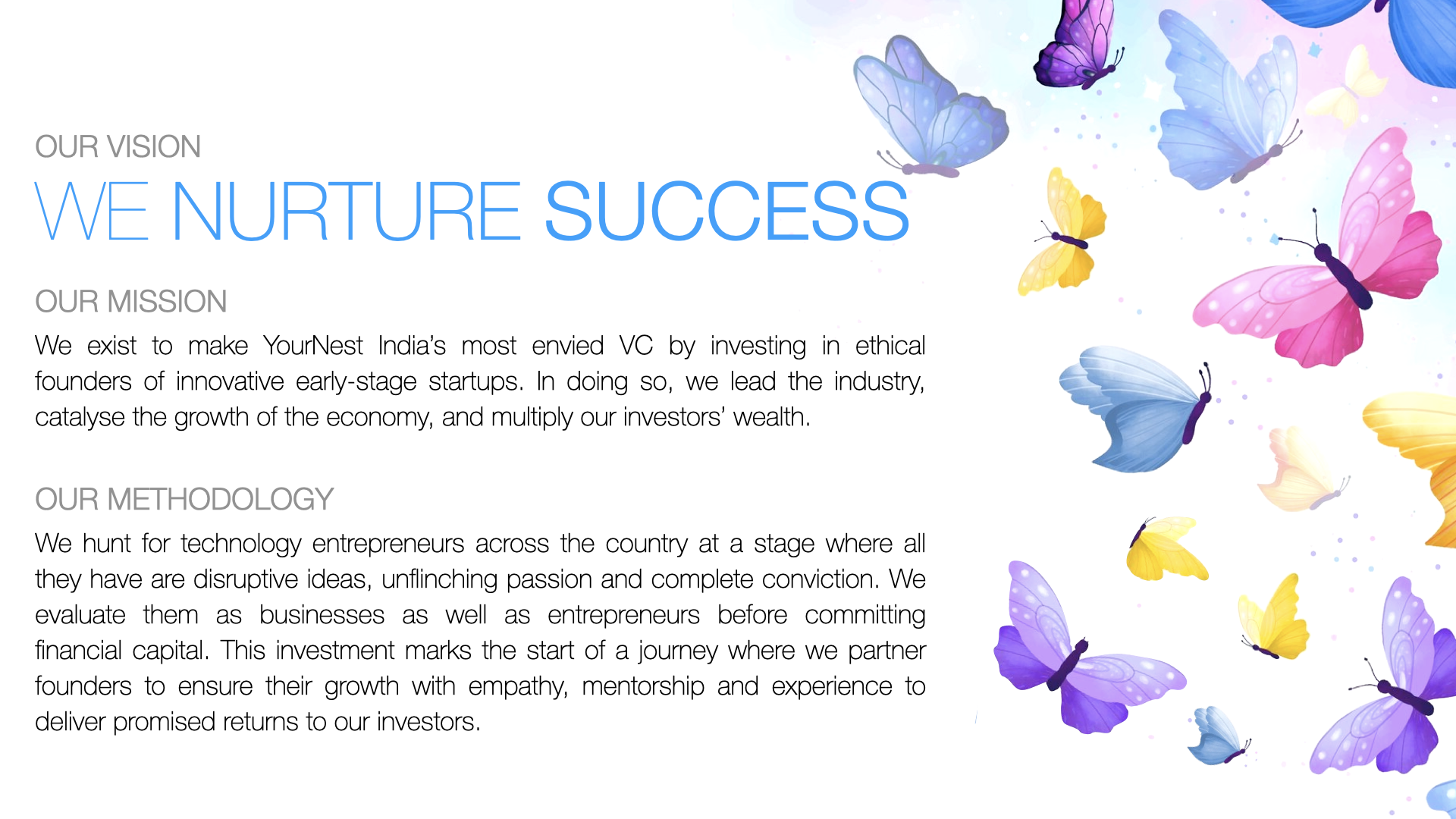 YourNest is among India’s leading early-stage venture capital firms focused on technology startups. Its unique investment thesis is founded on the concept of Nurture Capital which guides and mentors founders towards success.